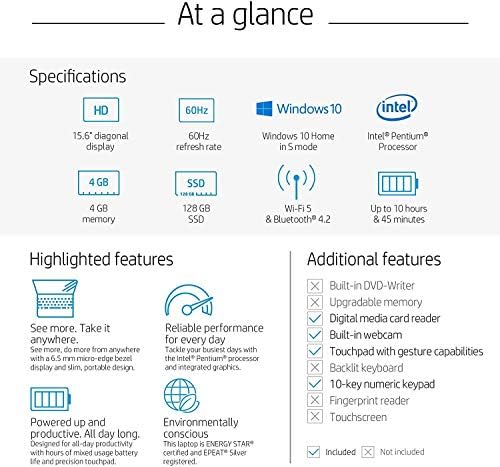 15.6″ diagonal, HD (1366 x 768), micro-edge, BrightView, 220 nits, 45% NTSC, Intel Pentium Gold 6405U (2.4 GHz base frequency, 2 MB L3 cache, 2 cores)