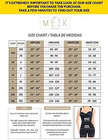 🎀 FIND YOUR IDEAL SIZE IN OUR SIZE CHART! Fajas’ sizes are different from usual clothes, that’s why it’s important to measure your waist and hips to find your size. Hips measures for BEGINNERS: (2XS 33-35″) (XS 36-37″) (S 38-39″) (M 40-42″) (L 43-44″) (XL 45-47″) (2XL 48-50″) (3XL 51-53″) (4XL 54-55″). If you are a regular faja user, find your size in the column EXPERT in our size chart. If you use your waist and hips measurements to find your size, it will fit (even if it looks too small).