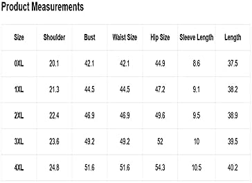 Large Plus: Shoulder:20.1″, Bust:42.1″, Waist Size:42.1″, Hip Size:44.9″, Sleeve Length:8.6″, Length:37.5″X-Large Plus: Shoulder:21.3″, Bust:44.5″, Waist Size:44.5″, Hip Size:47.2″, Sleeve Length:9.1″, Length:38.2″XX-Large Plus: Shoulder:22.4″, Bust:46.9″, Waist Size:46.9″, Hip Size:49.6″, Sleeve Length:9.5″, Length:38.9″3X-Large Plus: Shoulder:23.6″, Bust:49.2″, Waist Size:49.2″, Hip Size:52″, Sleeve Length:10″, Length:39.5″4X-Large Plus: Shoulder:24.8″, Bust:51.6″, Waist Size:51.6″, Hip Size:54.3″, Sleeve Length:10.5″, Length:40.2″