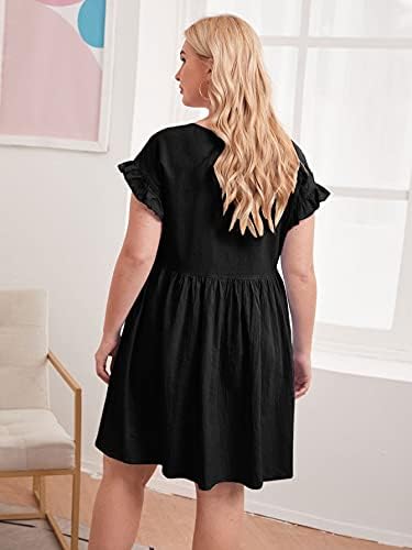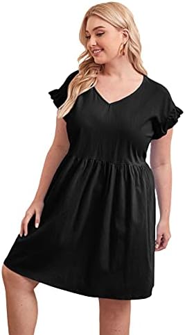 Feature: Plus Size Short Dress, Short Sleeve, V Neck, High Waist, Ruffle Cuff, Flared Hem, Smock Dress, Casual, Plain