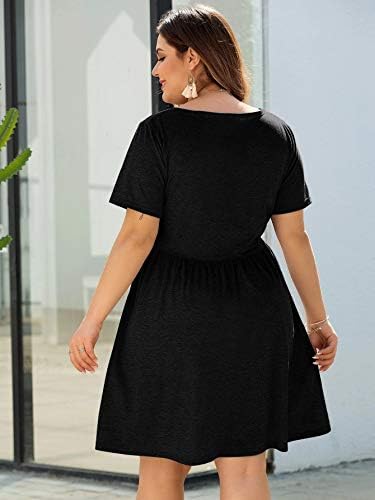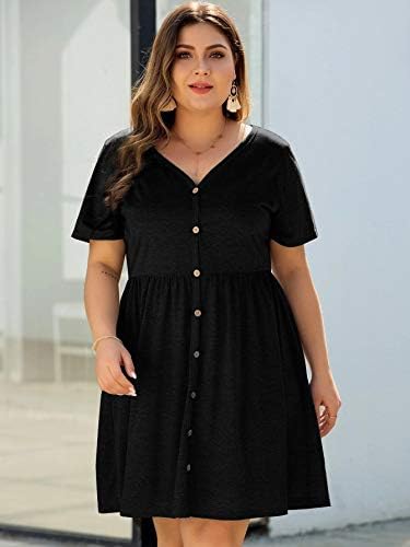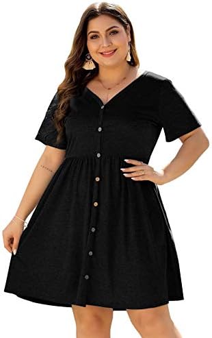 Feature: Plus Size Dress, Casual, V Neck, Short Sleeve, Button Front, Knee Length, Flared, A Line, High Waist