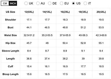 Size Chart:Large Plus: Shoulder:17.1″, Bust:44.1″, Waist Size:32.9-51.2″, Hip Size:45.7″, Sleeve Length:8.4″, Length:36.6″, Cuff:15.4″, Bicep Length:15.6″X-Large Plus: Shoulder:17.7″, Bust:46.5″, Waist Size:35.2-53.5″, Hip Size:48″, Sleeve Length:8.7″, Length:37.4″, Cuff:16.1″, Bicep Length:16.5″XX-Large Plus: Shoulder:18.3″, Bust:48.8″, Waist Size:37.6-55.9″, Hip Size:50.4″, Sleeve Length:8.9″, Length:38.2″, Cuff:16.9″, Bicep Length:17.5″3X-Large Plus: Shoulder:18.9″, Bust:51.2″, Waist Size:40-58.3″, Hip Size:52.8″, Sleeve Length:9.1″, Length:39″, Cuff:17.7″, Bicep Length:18.5″4X-Large Plus: Shoulder:19.5″, Bust:53.5″, Waist Size:42.3-60.6″, Hip Size:55.1″, Sleeve Length:9.4″, Length:39.8″, Cuff:18.5″, Bicep Length:19.5″