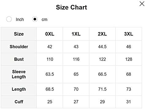 3X: Shoulder:18″, Bust:50.5″, Sleeve Length:27″, Length:28.75″, Cuff:12″