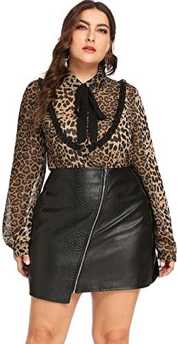 Women’s Plus Loose See Through Long Sleeve Tie Neck Leopard Print Tops Blouse