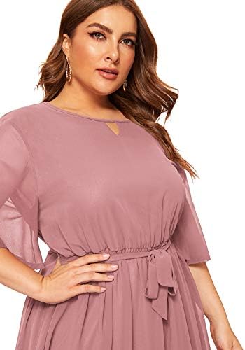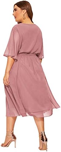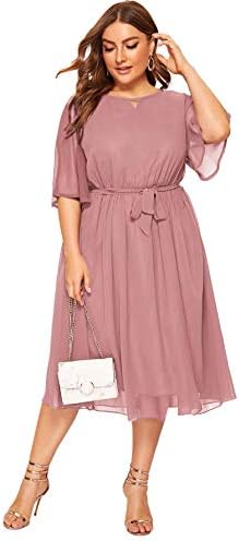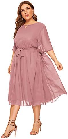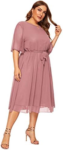 ROMWE Women’s Plus Summer Short Sleeve Round Neck 1/2 Sleeve Bow Tie High Waist Casual Dress