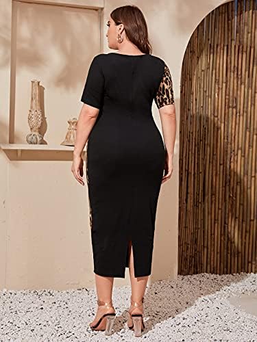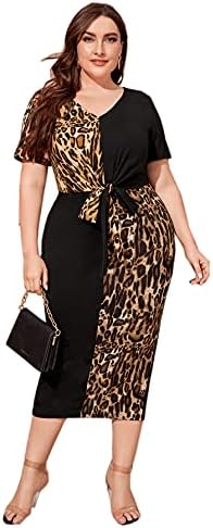 Leopard print, tie knot front, v neck, split hem, midi length bodycon dress for women