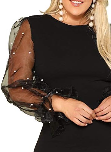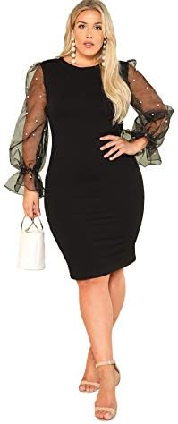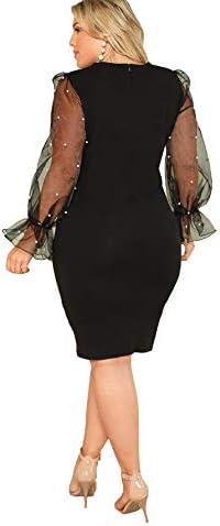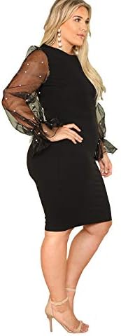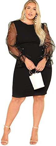 Features: plus size, round neck, beaded pearls long sheer sleeve,contrast mesh, knee length, high waist pack hip.