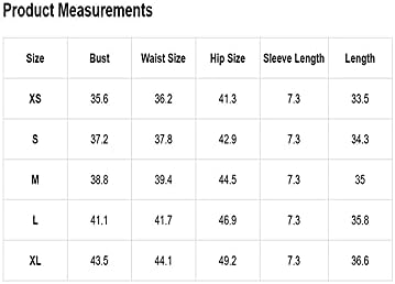 X-Small: Bust:35.6″, Waist Size:36.2″, Hip Size:41.3″, Sleeve Length:7.3″, Length:33.5″