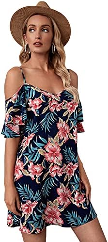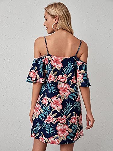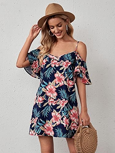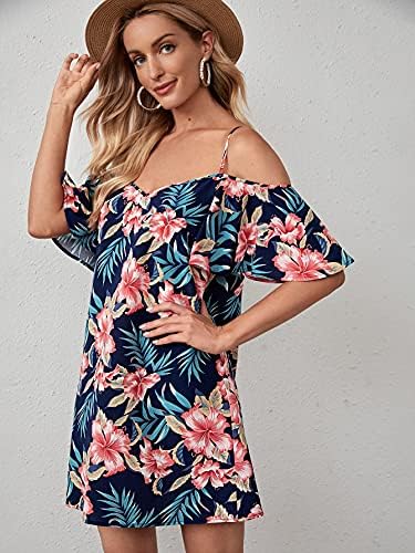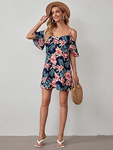 Feature: Boho, Floral Print, Tropical Print, Cold Shoulder, Short Dress, Flounce Sleeve, Ruffle Sleeve, Straight