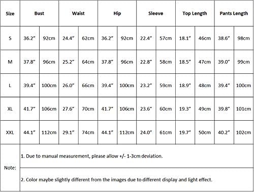 Bust 36.2″, Waist 24.4″, Hip 36.2″, Sleeve 22.4″, Top Length 18.1″, Pants Length 38.6″