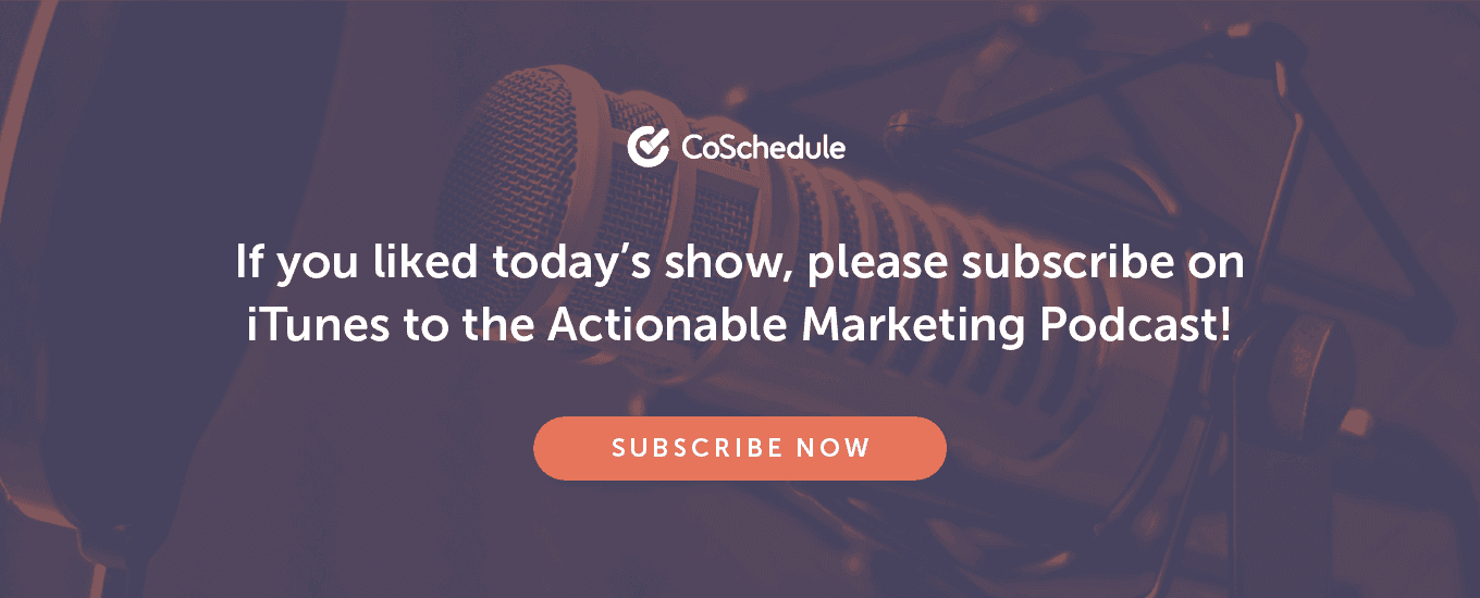 If you liked today’s show, please subscribe on iTunes to The Actionable Content Marketing Podcast! The podcast is also available on SoundCloud, Stitcher, and Google Podcasts.