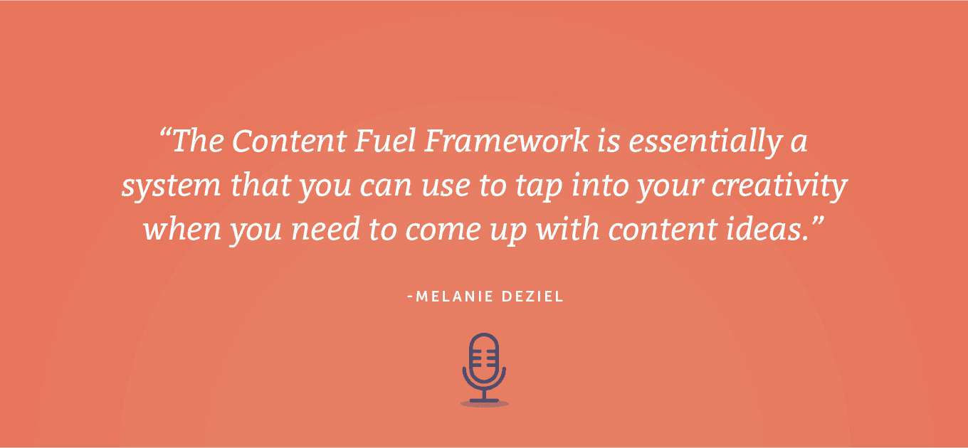 Melanie: The Content Fuel Framework is essentially a system that you can use to tap into your creativity when you need to come up with content ideas. Because what I found is that so much of what we do in marketing is so organized, regimented, and systematized. We’ve got spreadsheets and KPIs. We’re measuring and organizing everything except for the creative part of the process.