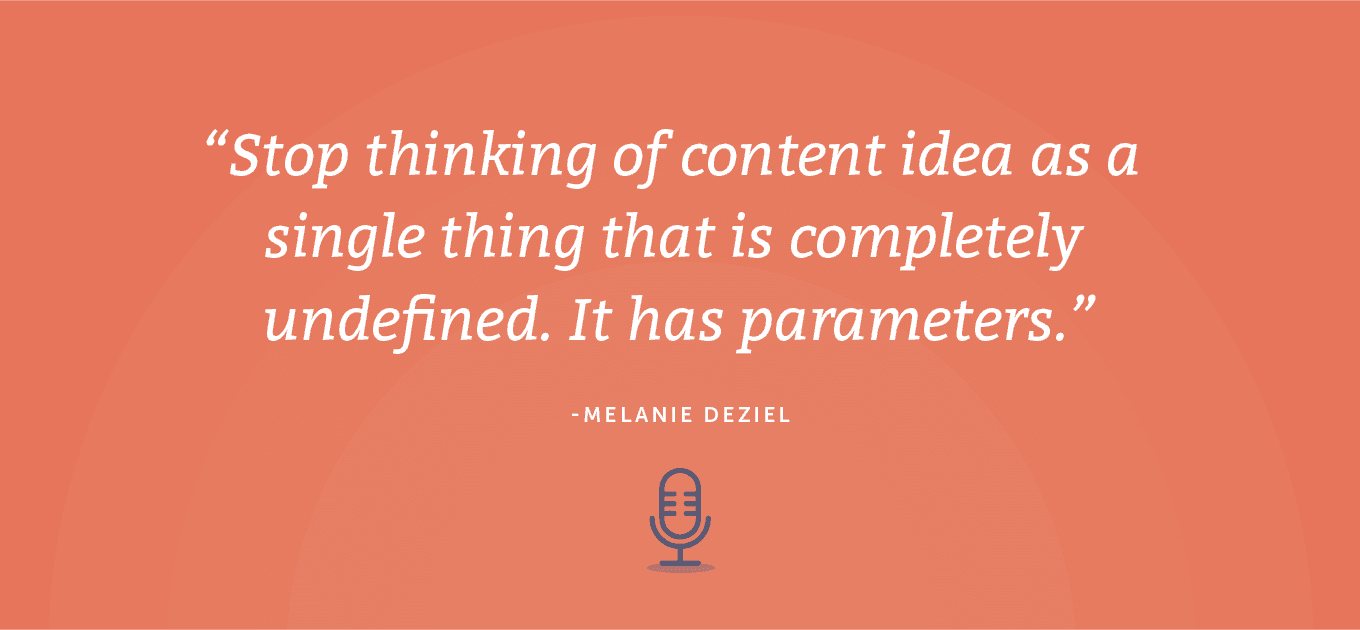 Melanie: Definitely, of course, go ahead and check out the book. I think before you even get there, there are some steps that can help you get a handle on it partially yourself. I think the first thing, and this is what I talked about in the early part of the book, is to stop thinking of the content idea as a single thing that is completely undefined. It has parameters. It has two main parameters. If you can understand that, it makes tackling this process much easier.